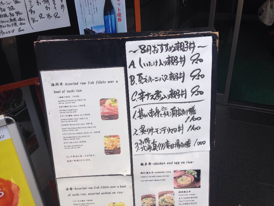 入口にあるメニューを見ると、「8月のおすすめ親子丼」として「しいたけ入り」「夏ズッキーニバター」「辛ナス煮入り」と初めて見る親子丼が並んでいます。すごいなこの創作親子丼のラインナップ。もちろんここまで攻めてこられたからには私も親子丼に行きたいところなのですが、ちょっと待てよ。その下には「勘八刺身とミニチキン南蛮御膳」ですって? 以前にも書いたと思いますが、私、刺身も好きならチキン南蛮にも弱い男なのですよ? そこにこのキラーメニューをぶっこんで来るとは私への挑戦でしょうか。だいぶ迷いを生じつつ、階段を下りてみましょう。