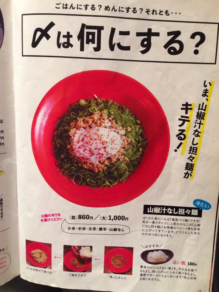 どうでもいいけど、英語で「辛い」って「hot」って訳すことが多いですよね。この担々麺とか訳出できるんでしょうか。「cold but hot Dam Dam Noodle」って意味がわかんないと思うけど。「spicy」で回避するのかなぁ。さらに「イケてる」を「Cool」って訳すのも混乱に輪をかけそうです。「Cold but hot Dam Dam Noodle, this is cool!」ってどうしてくれるんだ。まぁでも日本語でも「からくてつらい(辛くて辛い)」とかあるからあんま人のこと言えないか。