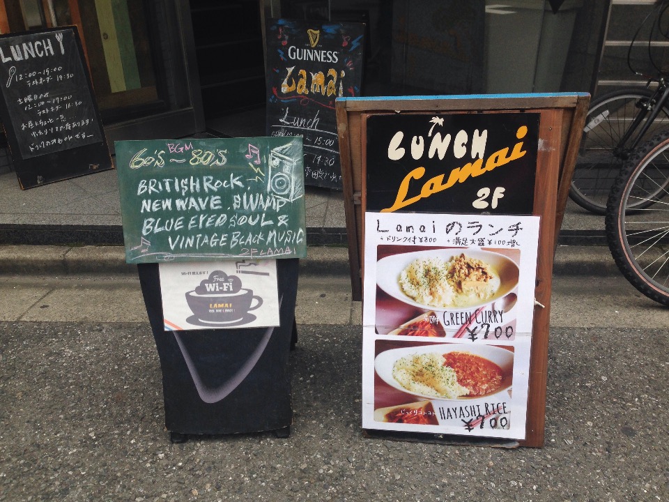 看板をチェックしてみるとグリーンカレー、いいじゃん。美味しそうじゃん。そしてBGMが書いてあって、BRITISH ROCKに、NEW WAVEに、SWAMP、BLUE EYED SOULに、VINTAGE BLACK MUSICですって!