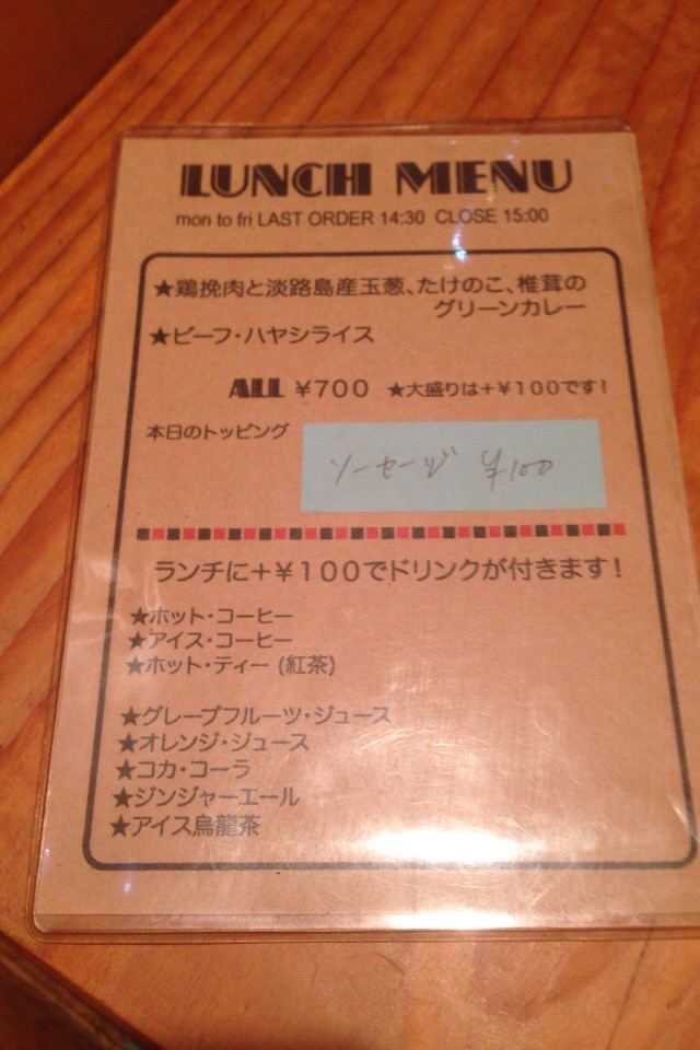 お店の方がメニューを見せてくれたので、予定通り、グリーンカレーを注文。この辺りで700円はお得ですね。テンション上がってソーセージをトッピングして、コーヒーまで続けて頼んでしまいました。わーい。