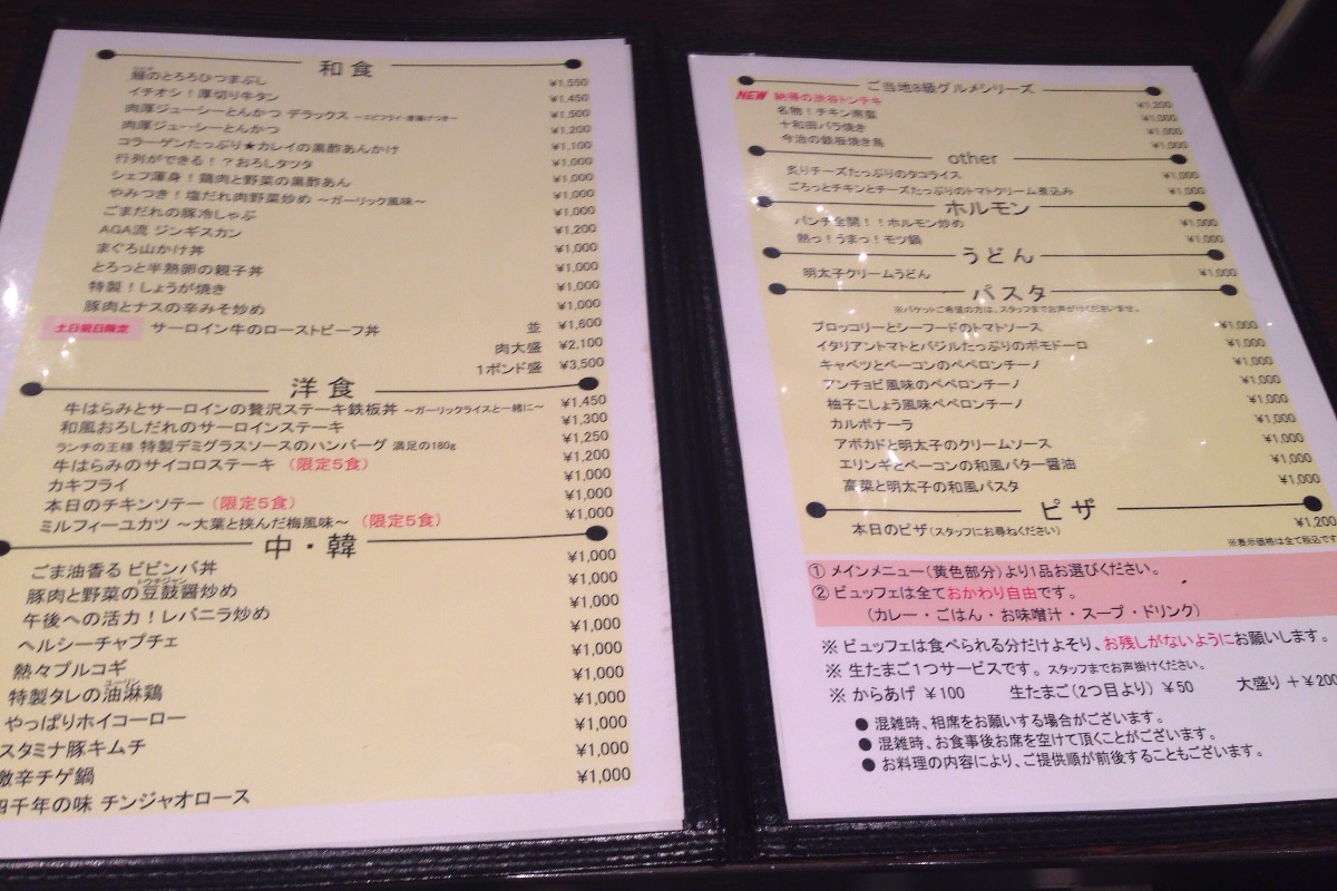 壁ぎわにはビュッフェコーナーがあって、ランチを注文するとここから自由に飲み物、食べ物をとることができます。オレンジジュースなどのアイスドリンクが6種類、ホットコーヒーがあります。すごいのはライス、カレー、みそ汁、スープがとり放題。カレーは「なくなったら終了」とは書いてありますけれど、ビュッフェにカレーライスってあんた、どんだけ太らせる気なんですか。クリスマスまでにあたしを太らせてどうしようってんだい。