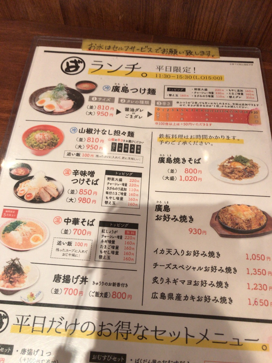 いさんで廣島お好み焼きを注文すると「15分~20分くらいかかりますけどよろしいですか?」と確認されました。担々麺頼んでた隣のお姉さんは別にそんなことを言われてなかったので、おそらくお好み焼きを頼んだ時に発生するタイムラグだと思われます。鉄板を温めるのに時間がかかるとかかな。ちなみに隣のお姉さんは中辛の野菜大盛を頼んでました。前回私は小辛でも辛すぎると思ったのですが、けっこう剛毅だね。大丈夫かな(余計なお世話)。