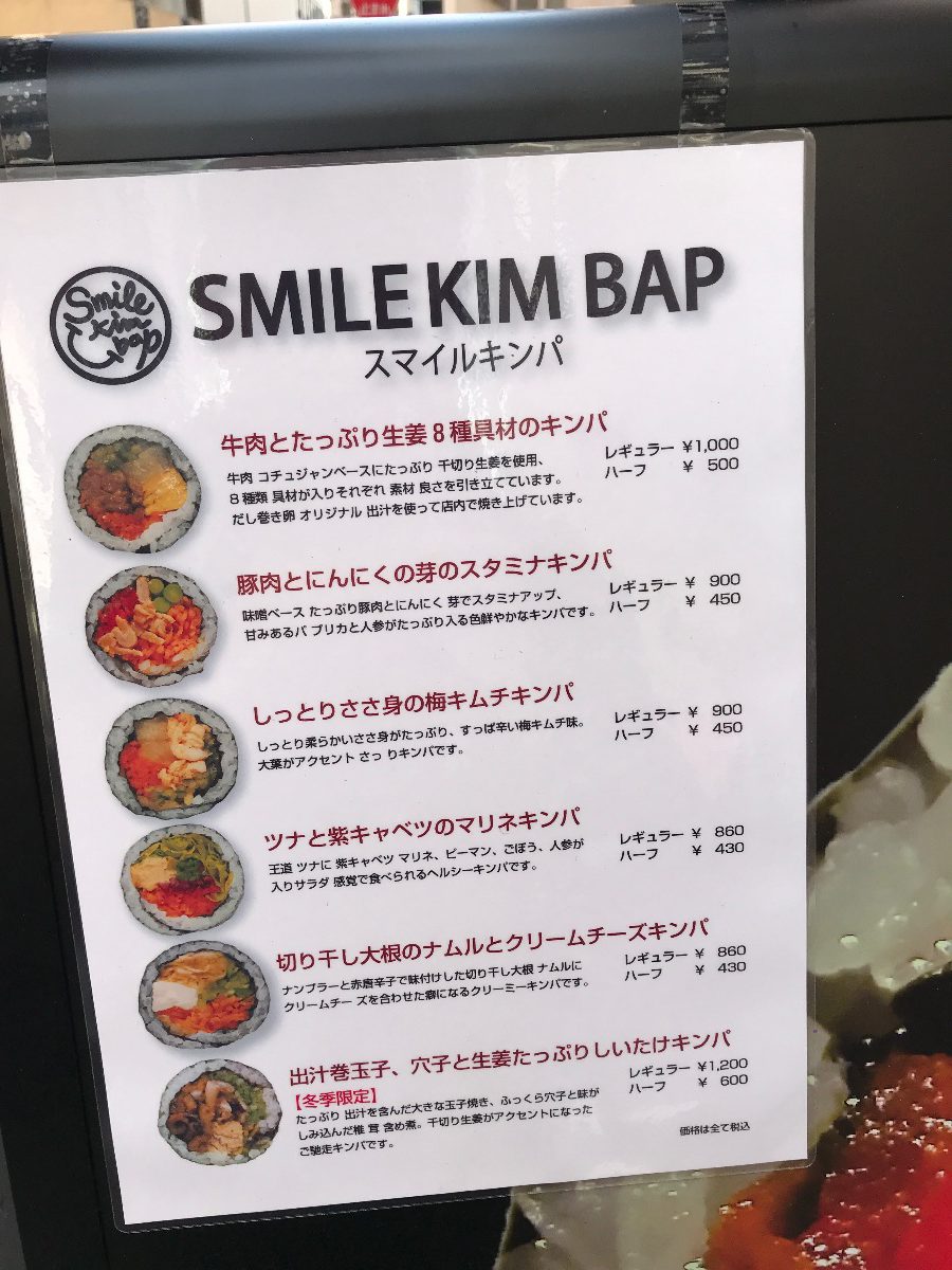 はじめまして。渋谷二丁目で働いています。「スマイルキンパ」のボリューム感が知りたくて(昼メシにはハーフでいいのかフルサイズか)、行った方の感想を探していてこちらを見つけました。フルサイズで良さそうですね(笑)
