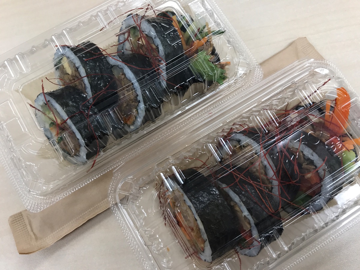 じゃあ、2種類買っていっちゃおうカナー。というわけで「牛肉と生姜たっぷり8種具材のキンパ」と「豚肉とにんにくの芽のスタミナキンパ」を買うことにしました。丁寧にお箸とお手拭きも入れてくれました。
