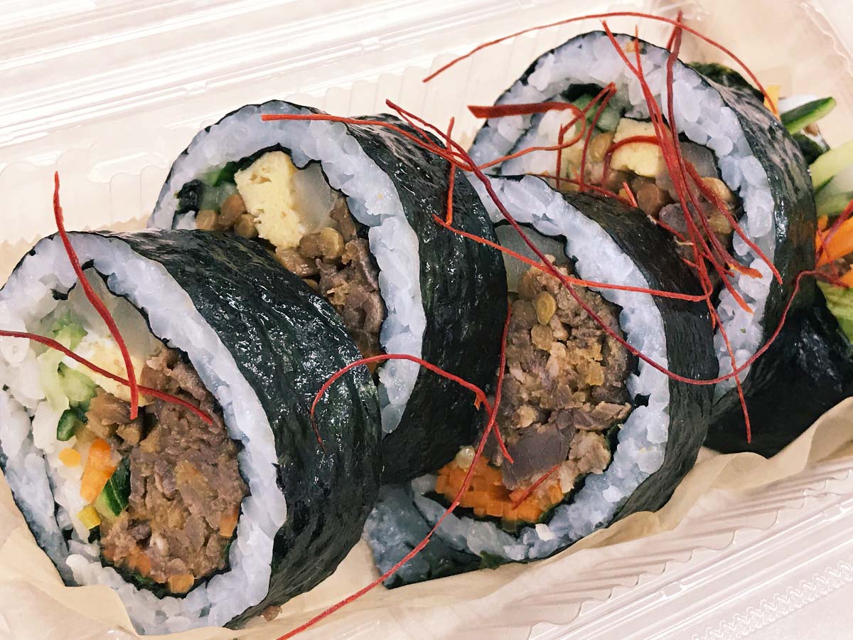 ではまず、「牛肉と生姜たっぷり8種具材のキンパ」から……