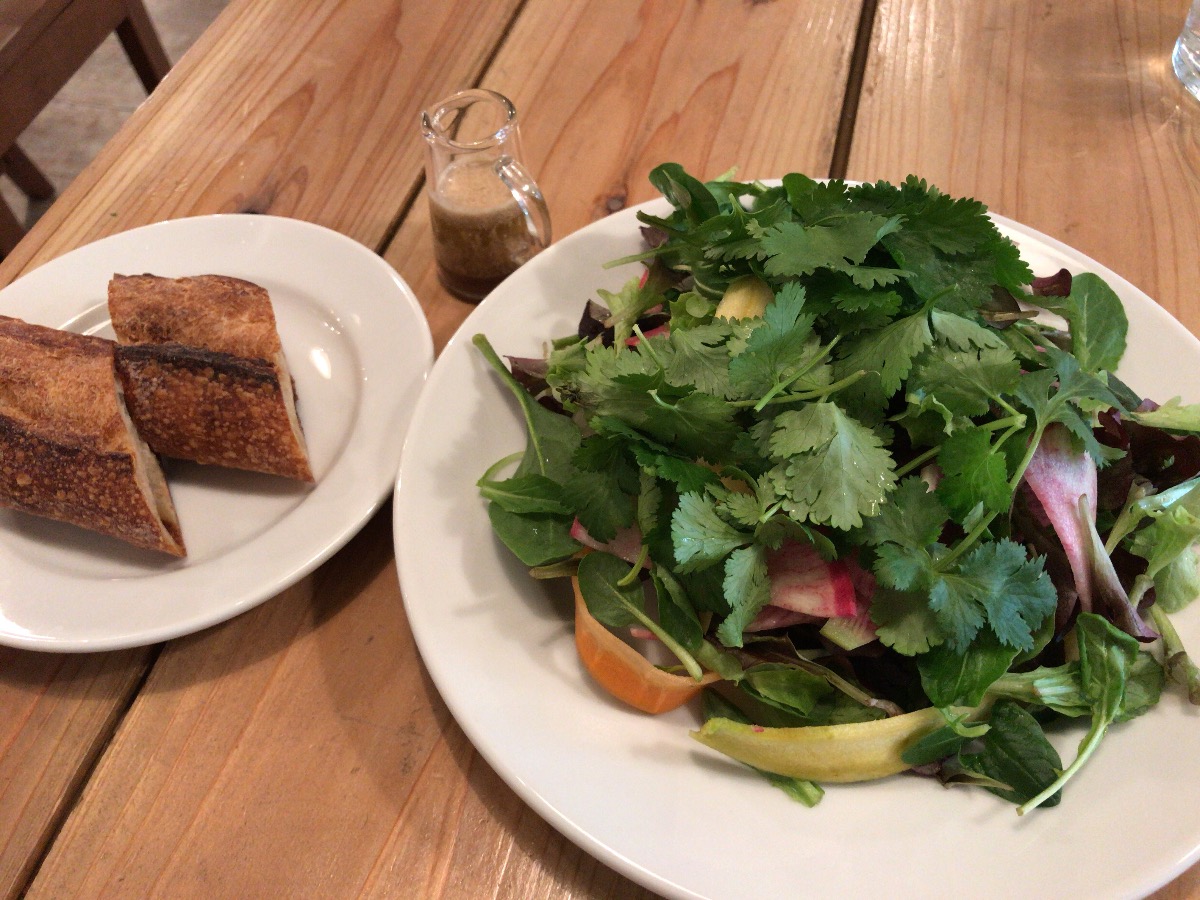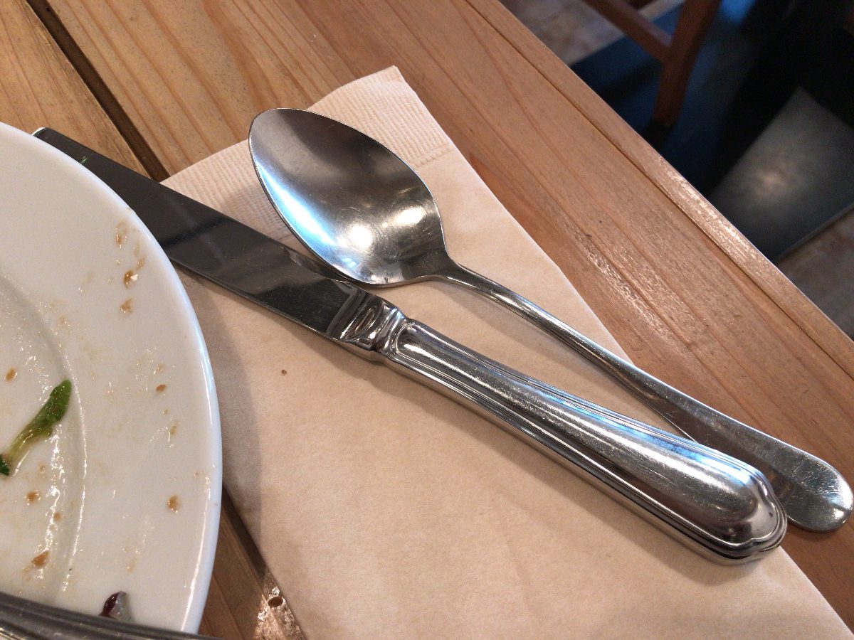 野菜の上にパクチーを山盛りトッピングて、私がそう注文したんだけどちょっと可笑しみありません? いや、これが自然派の食事です。風邪を祓うには食生活から。元気モリモリ野菜パワーですよ。しかしせっかくカトラリー揃えてもらってもナイフとスプーンの出番ないんだけど(スープ用スプーンはスープについてきた)