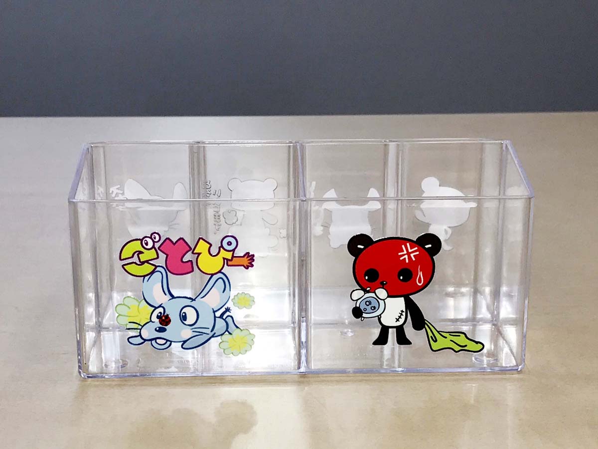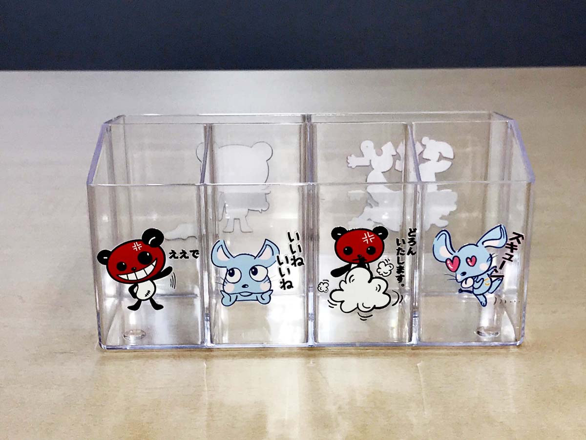 ごとぴーの入ってないペンスタンド(しつこい)。キレパンダも入ってません。2列の広いケースと4列の小さめのケースが合体しています。クリア素材で中身が見えるので、ごとぴーやキレパンダが入ってないことがよくわかります。小さいモノ入れても消失しなくていいですね。気分によって見える面を変えてご利用するといいんじゃないでしょうか。コメントが適当ですみません。