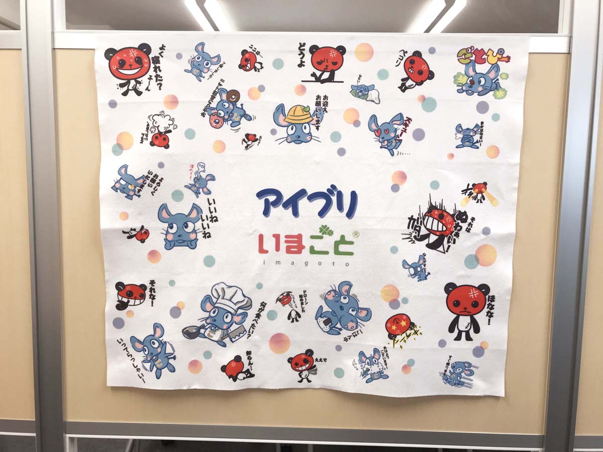 こういうのなんて名前で呼べばいいのかわからないのでアイブリ布と名付けました。タペストリーでいいの? 「アイブリ」と「いまごと」のロゴ、それにありったけのごとぴーとキレパンダを投入した、アイブリ渾身のアイブリ布です。