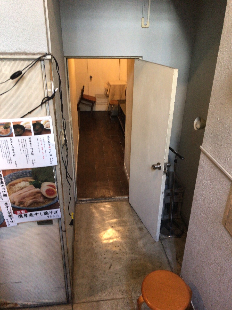 煮干し中華そばはるいちさんのドアの横をすり抜け、正面のドアを抜けると、そこは雑多に家具が積み上げられた廊下。