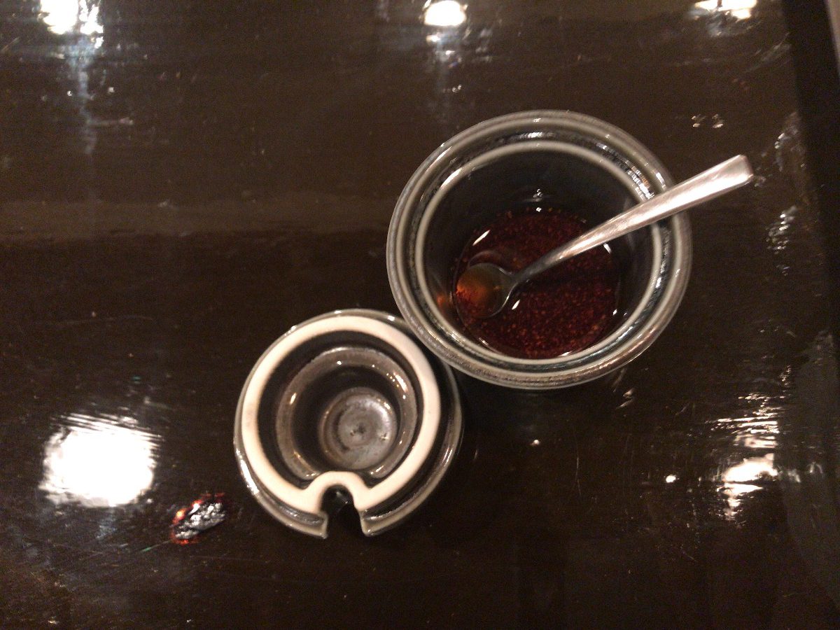 小瓶にいれた辣油をくれました。ふむー。タレに落としてピリ辛を追加。美味い美味い。