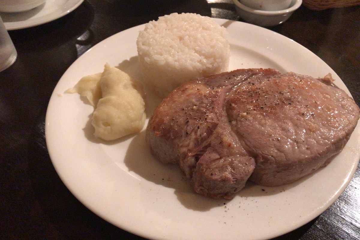 スープとコールスローサラダの後、登場するのがこのメインの豚ステーキ。この堂々たる厚さ。すごいでしょ。最厚部で2cm超えてそうです(担当者目測による)。しかも味も絶品。そこらの大味なステーキハウスだと肉焼き過ぎて固くなってたりしますけど、こちらはほんのりピンク色が残って、火は通ってるけどレア。すごい。美味しい。厚い。美味しい。