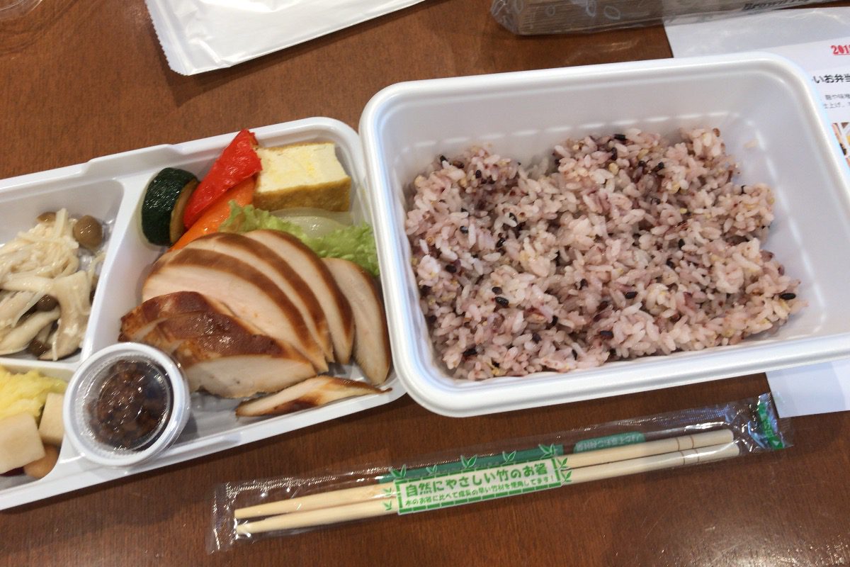 行ってみると、カラダにやさしいお弁当。いや、よく見たら昨日のかんばんにもお弁当のお店って書いてあるか……。主菜をお肉とお魚、ごはんを雑穀米と炊き込みご飯から選べるとのこと。むむむ。肉×雑穀米のペアでお願いします! 店内のイートインで食べていきたいです!