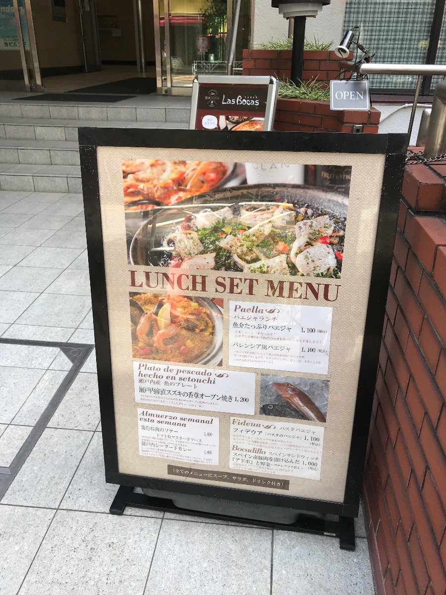どうせ下るなら下りきってやろうじゃねぇか、というわけじゃあないんですが、ふと目に留まったのが半地下のお店。これはいったい……?と見てみるとパエジャがランチメニューに並んでいます。スペイン料理かー。