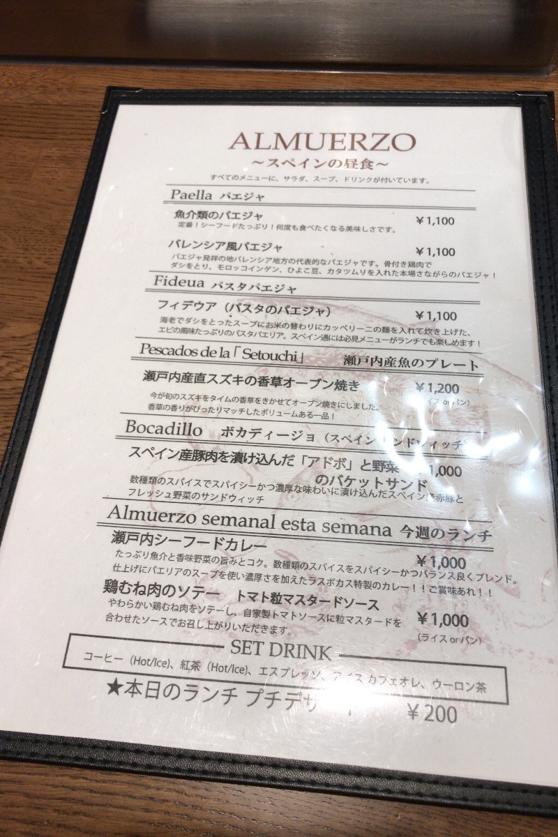 回転する皿との格闘を乗り越えて食事が終わると、お店の方がコーヒーを持って来てくださり、代わりにお皿を下げてくれたので一安心。濃い味のホットコーヒーを楽しませて頂きました。ランチメニューをよく読むと、バレンシア風パエジャにはカタツムリが……スペインでも食べるんだ。次回、勇気を出して頼んでみる……か?