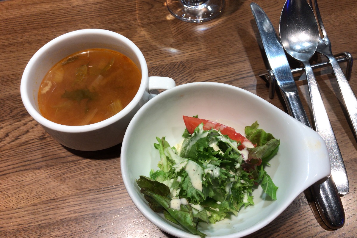 スープが美味しい! 出汁がしっかりとってあって、コショウが訊いてていいお味です。これは期待が高まります。サラダもいい感じ。