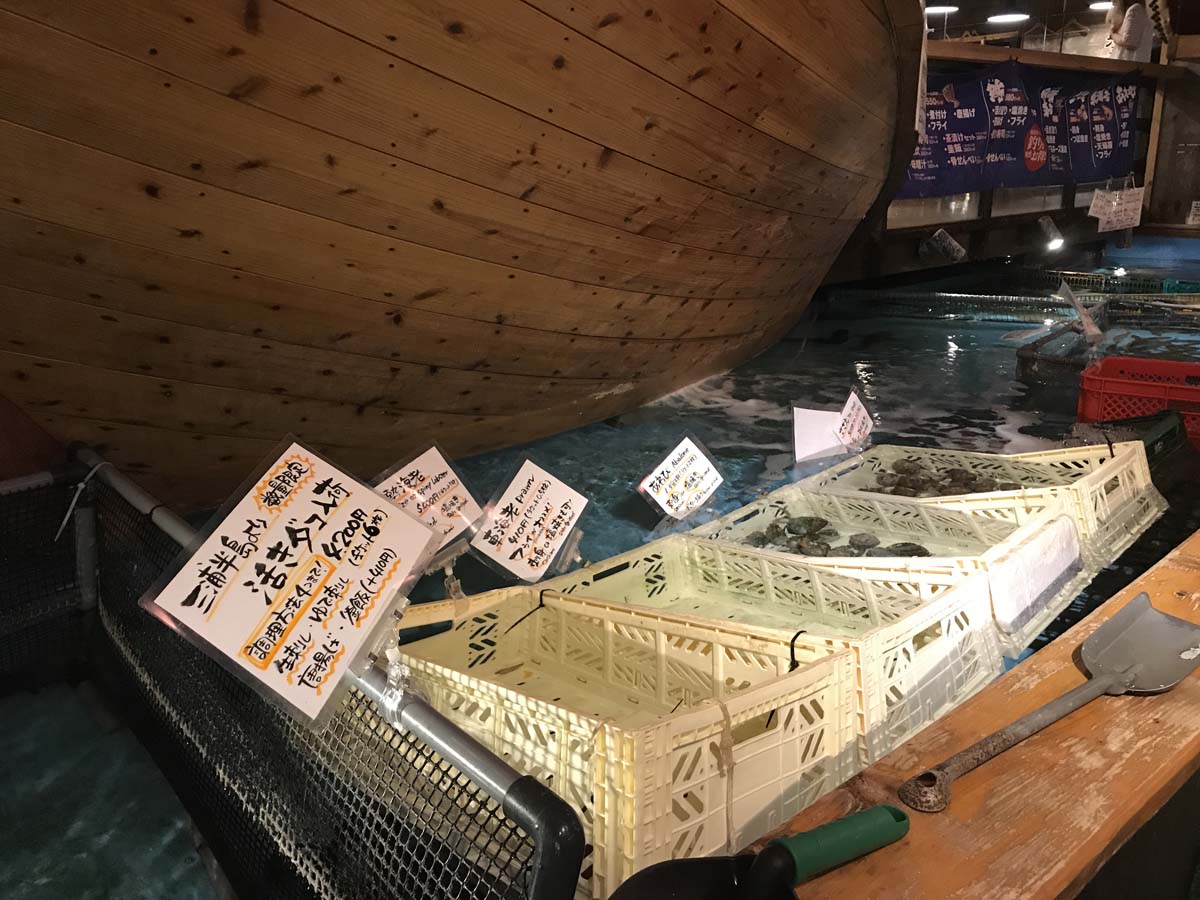 渋谷店は上下二層の水槽がありまして、上はしまあじ、かれい、鯛なんかの餌釣り。下はひっかけ釣りのさざえや伊勢エビ、などなどなど、いろんなお魚があります。アイブリ(魚)がいたらまさにアイブリ対決で共食いだったんですが、アイブリ(魚)はいませんでした。